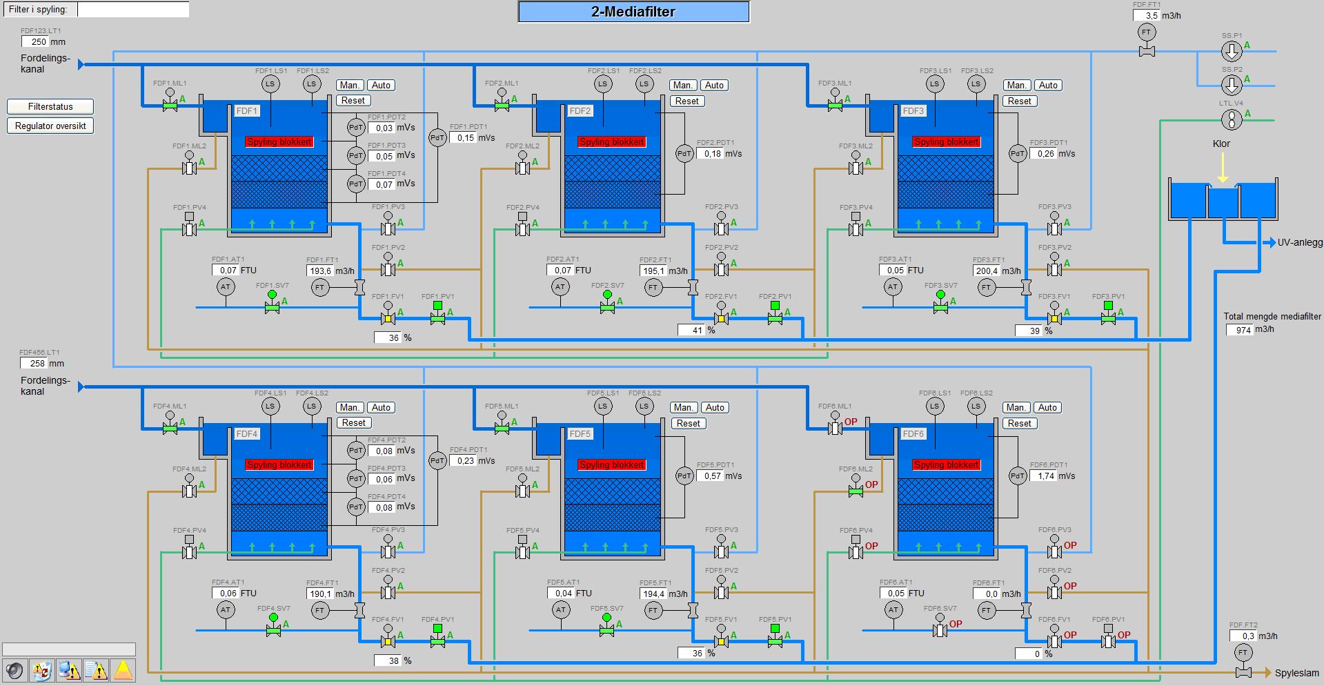 Etter forbehandlingen går vannet til filtrering i 6 parallelle mediefiltre. Denne filtreringen har til hensikt å fange opp små partikler som ikke fjernes i forbehandlingen. Mediefilterene består av tre ulike lag. I bunnen ligger det et lag med pukk. I midten har vi et lag med sand og på toppen ligger det et lecamatriale. Vannet ledes inn i toppen av filterene og renner ned gjennom dem før det ledes videre. Mediefilterene må med jevne mellomrom rengjøres for oppsamlede partikler ved tilbakespyling.