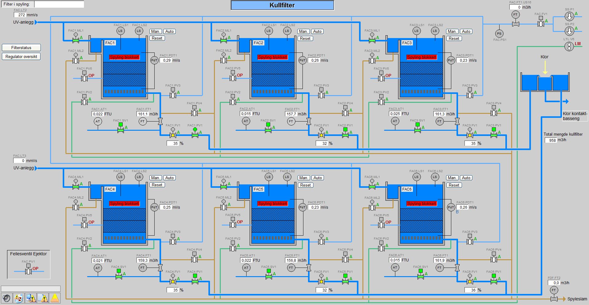 Etter mediefiltrering går vannet via UV-anlegget og videre til ytterligere filtrering i 6 parallelle kullfiltre. Kullfiltreringen absorberer kjemiske stoffer og hovedhensikten er å redusere uønsket lukt og smak fra vannet. I tillegg får man også fjernet små partikler som har sluppet i gjennom mediefiltreringen. Over tid mister kullet i filtrene evnen til å absorbere kjemiske stoffer og det må da byttes ut med regenerert kull. Kullfiltrene må også med jevne mellomrom rengjøres for oppsamlede partikler ved tilbakespyling.